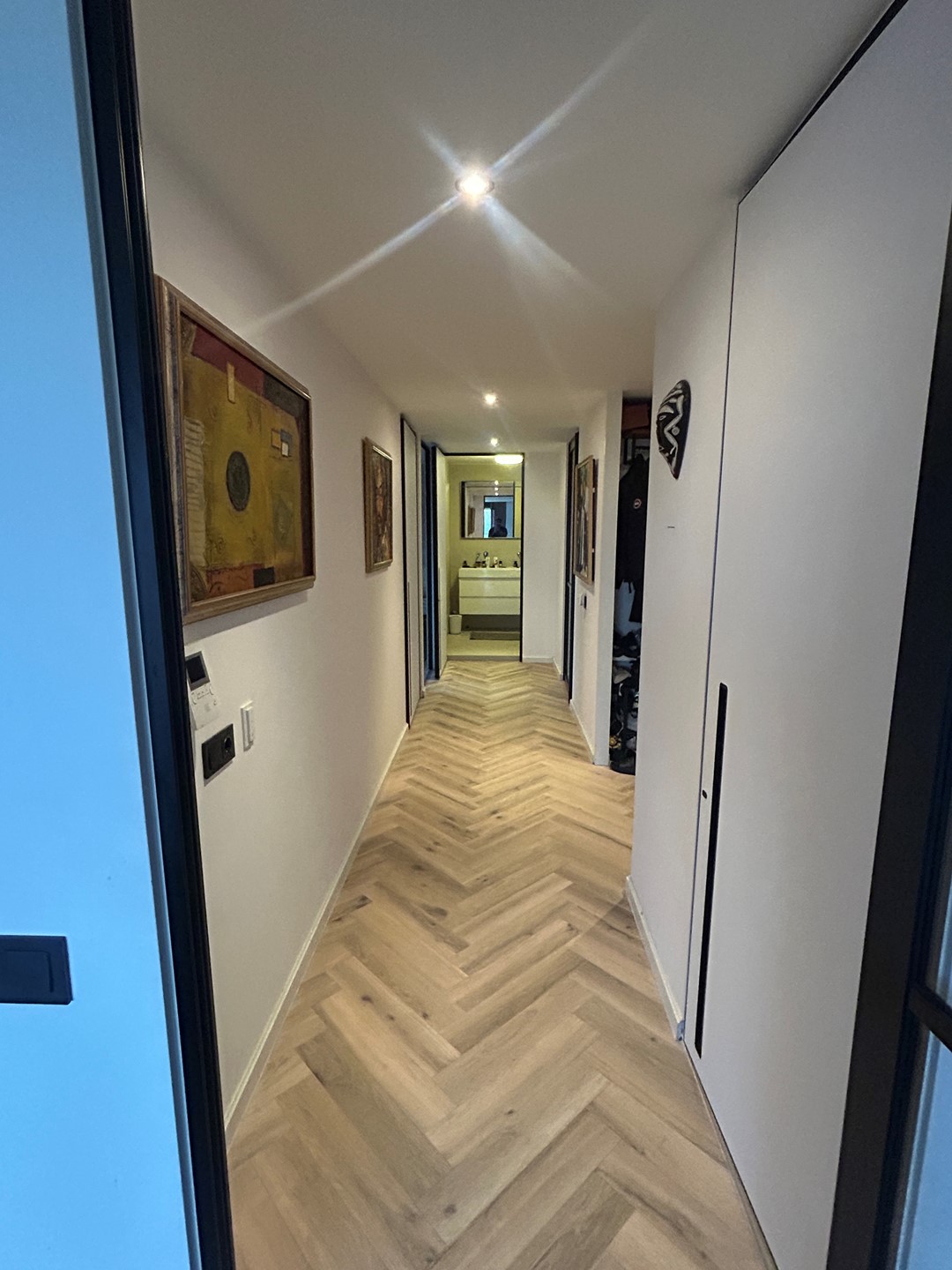 Eenmaal binnen valt meteen de ruimte op. De hal is royaal en geeft toegang tot een praktische bergkast, het separate toilet en de verschillende vertrekken. Er zijn twee goed bemeten slaapkamers, ideaal als hoofdslaapkamer en werk- of logeerkamer.