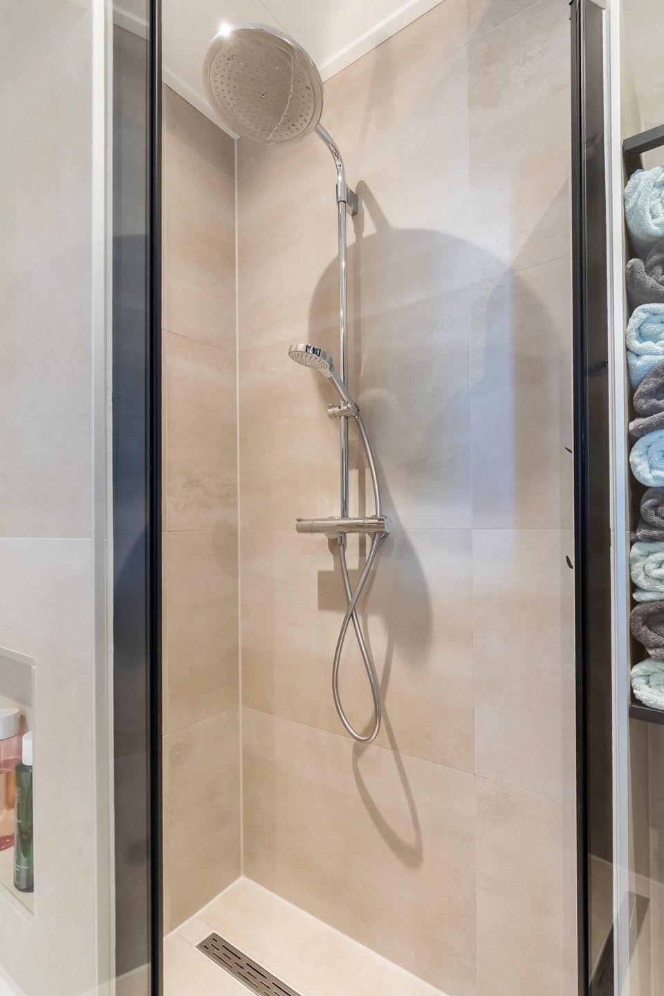 De luxe badkamer is vernieuwd in 2023 en modern uitgevoerd met onder andere een inloopdouche, toilet en elektrische vloerverwarming – een comfortabele en stijlvolle ruimte.