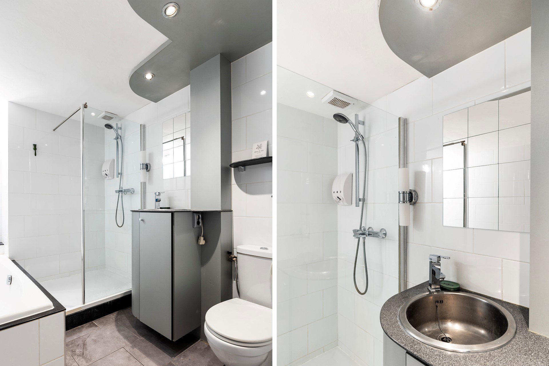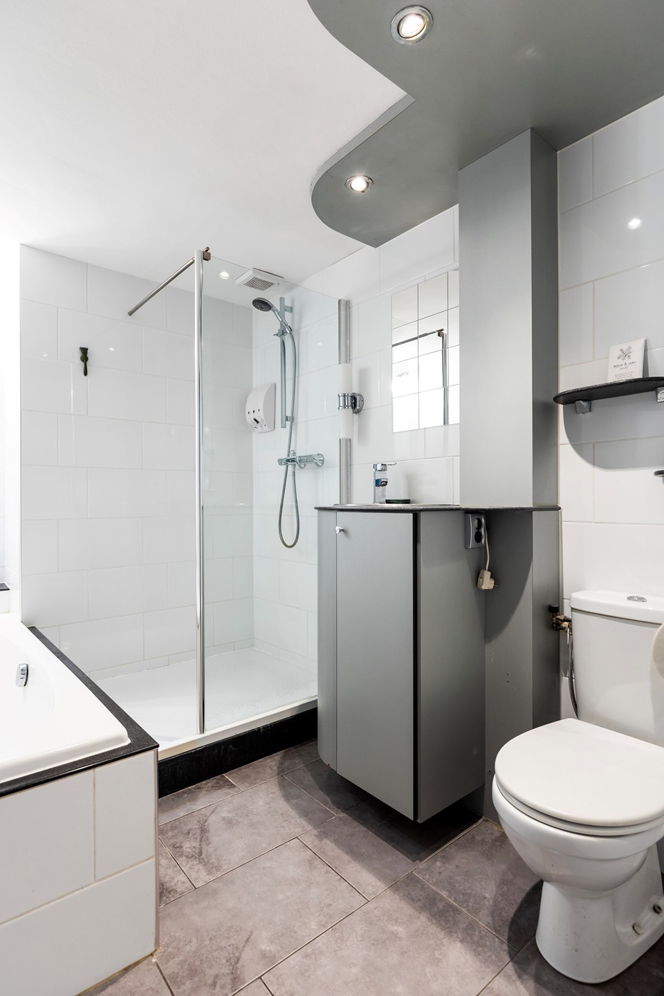 De badkamer is strak en modern afgewerkt en beschikt over een verzorgde uitstraling en comfortabele voorzieningen.