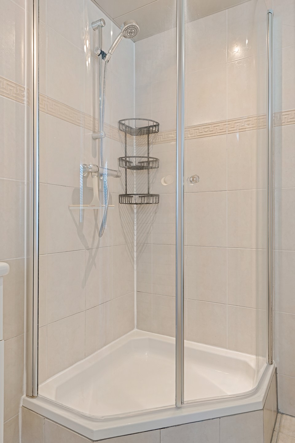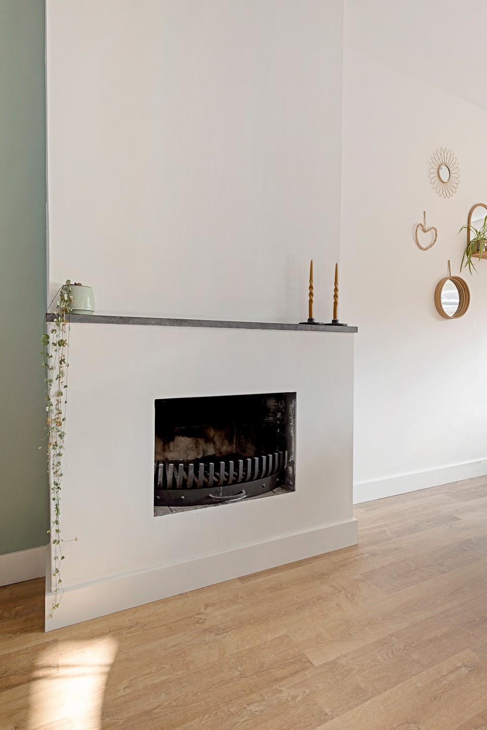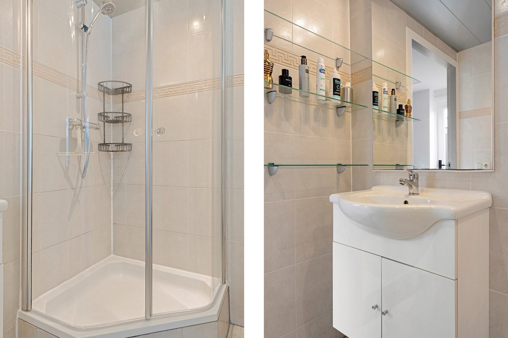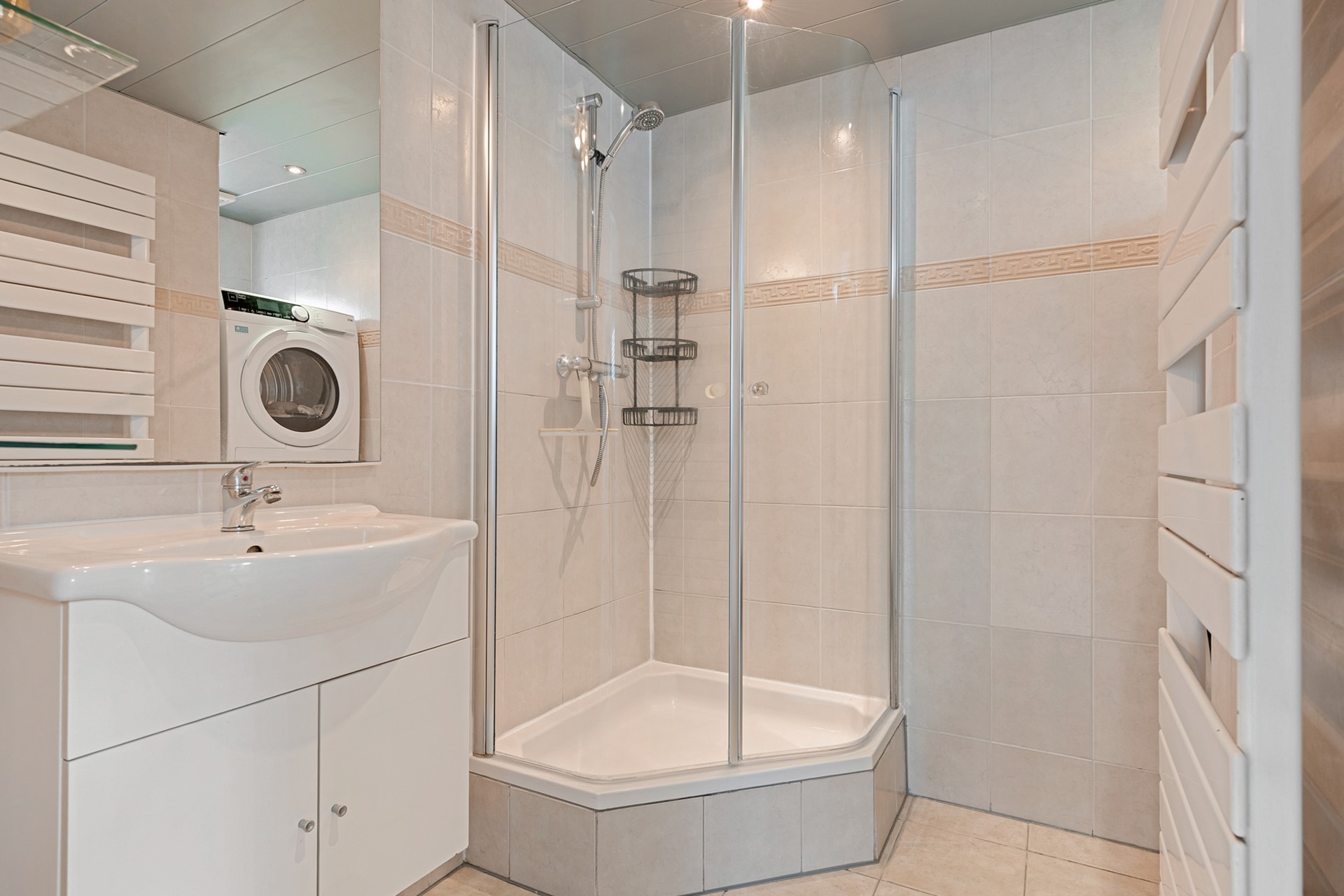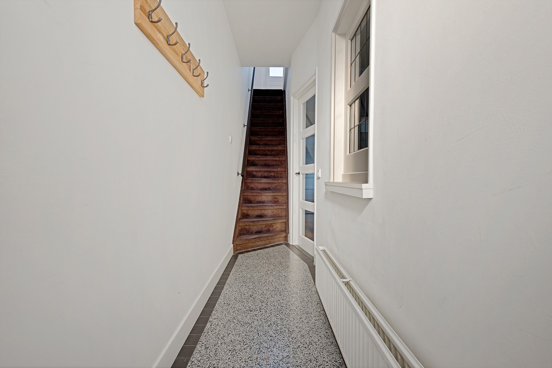 Entree hal met vernieuwde meterkast (6 groepen en 2 aardlekschakelaars), prachtige tegelvloer, trapopgang en toegangsdeur tot de woonkamer. De woonkamer is afgewerkt met een laminaatvloer met vloerverwarming, stucwerkwanden, stucwerk, open haard en kelderkast. Vanuit de woonkamer toegang tot keuken. De keuken is in 2022 vernieuwd en voorzien van koelkast met diepvries, afzuigkap, 4 pits gaskookplaat, vaatwasser en combimagnetron. Vanuit de keuken toegang tot de achterdeur, badkamer en separaat toilet. De badkamer is geheel betegeld en er is een vaste wastafel, douchecabine en de aansluiting wasmachine/droger. Toilet en badkamer hebben beide mechanische ventilatie.