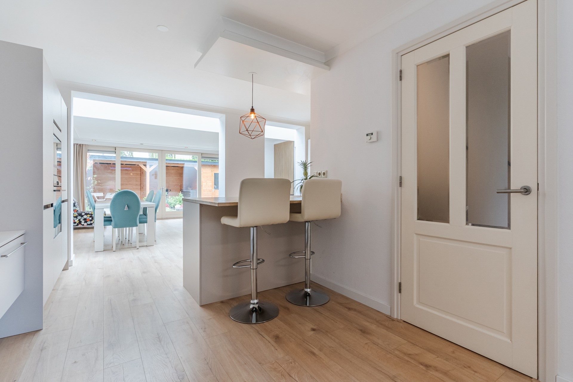 Aan de achterzijde van de woning is de ruime eetkamer gesitueerd welke beschikt over een lichtstraat wat zorgt voor veel natuurlijke lichtinval. Daarnaast beschikt deze ruimte over een gashaard en riante schuifpui. De hal en het woon- en eetgedeelte is voorzien van laminaatvloerafwerking, stucwerk wanden en plafonds.
