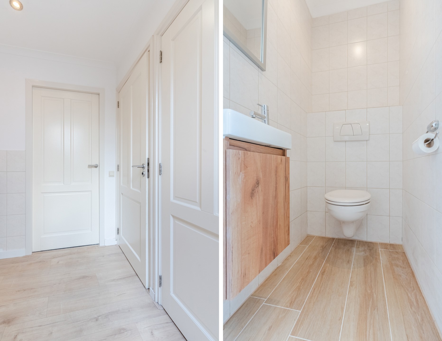 Vanuit de keuken is de bijkeuken te betreden, hier bevindt zich kastruimte, het toilet en de witgoedopstelling. Vanuit de bijkeuken is de hal met toegang tot de oprit en achtertuin te betreden, welke kan dienen als berging.