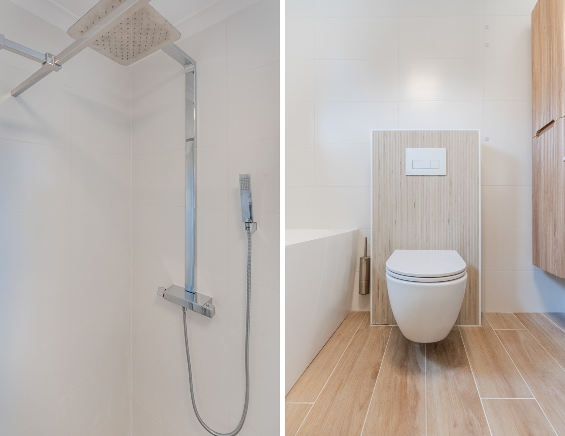 De overloop geeft toegang tot drie ruime slaapkamers en de badkamer. De kamers en overloop zijn afgewerkt met visgraat pvc-vloer en stucwerk wanden. De badkamer is 2 maanden terug vernieuwd, volledig betegeld en voorzien van douchecabine, ligbad, hangtoilet, handdoek-radiator, opbergkast en wastafel in meubel.