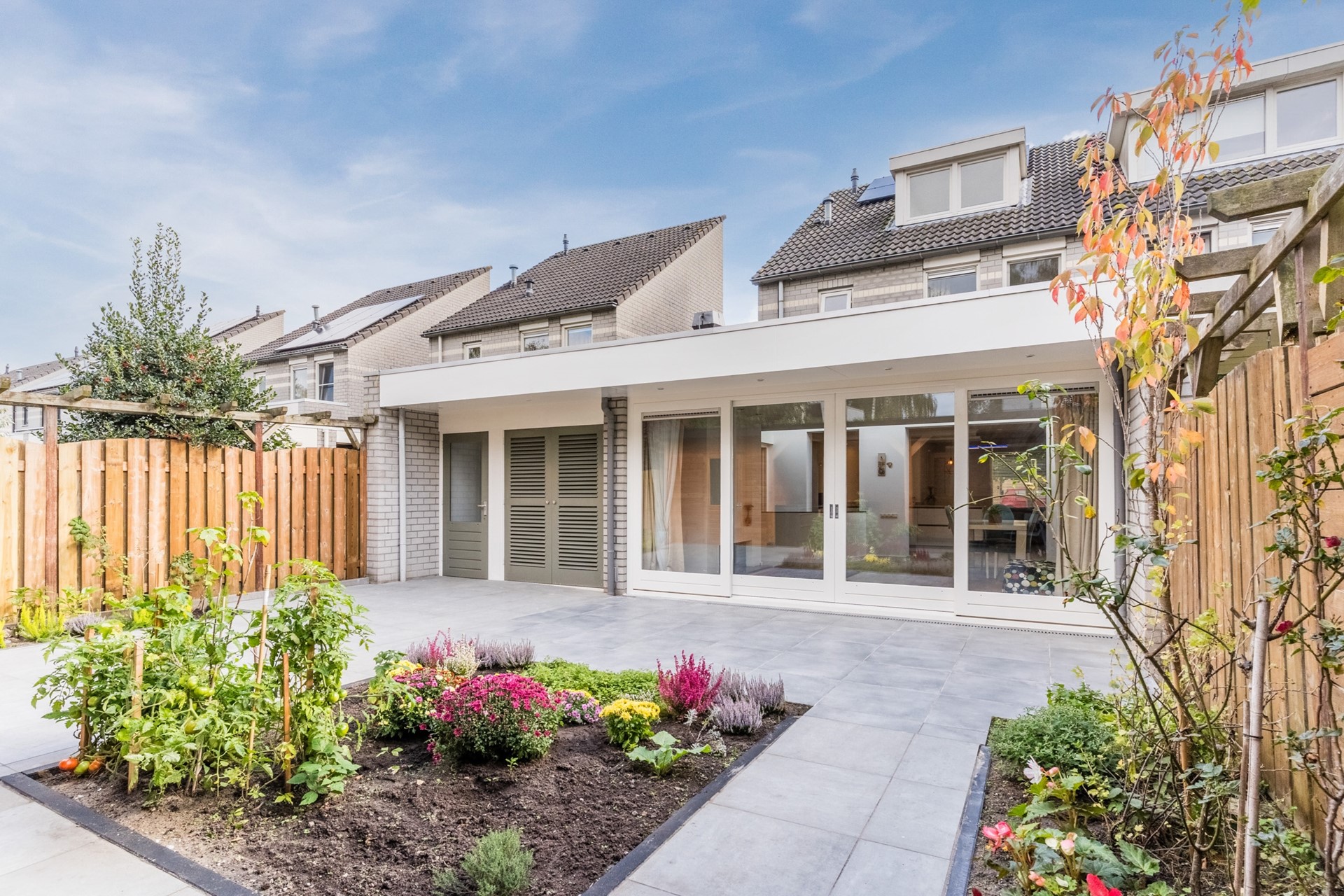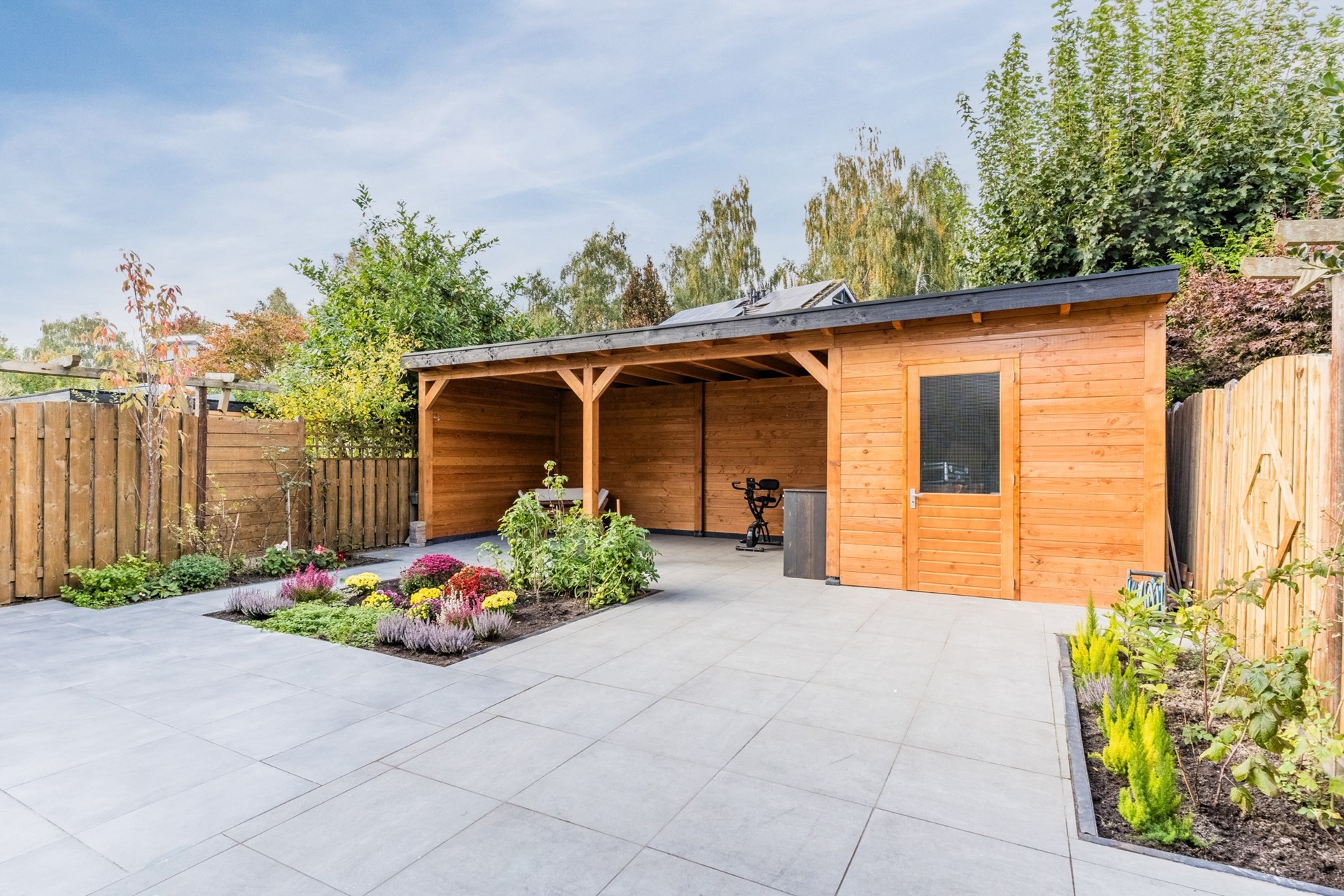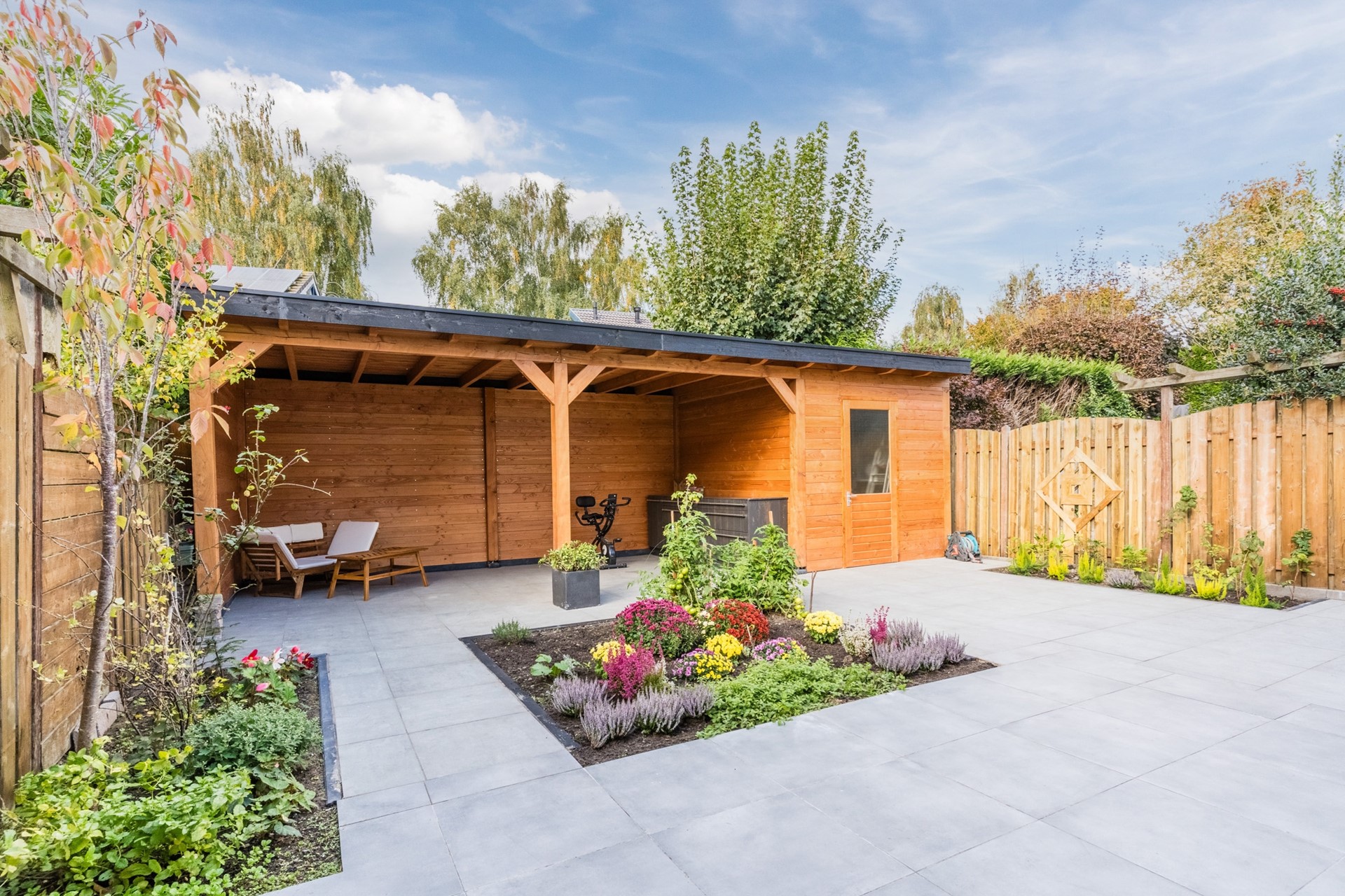 De achtertuin is gelegen op het noordwesten en is strak aangelegd. Het ruime terras is afgewerkt met moderne tegels voor een rustige en luxe uitstraling. Daartussen liggen borders met kleurrijke beplanting wat zorgt voor een sfeervol geheel. Aan de achterzijde bevindt zich een houten overkapping met berging, ideaal om te loungen en het bergen van het tuingereedschap en fietsen. De achtertuin is verder voorzien van privacy rondom.