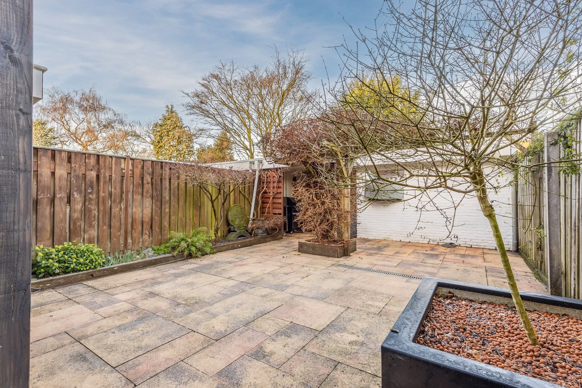 De achtertuin is gelegen op het noorden en is onderhoudsvriendelijk aangelegd met tegels en beplanting in borders. Daarnaast beschikt de tuin over een overkapping en externe berging van circa 8 m², ideaal voor fietsen en extra opslag. De tuin beschikt tevens over een achterom.